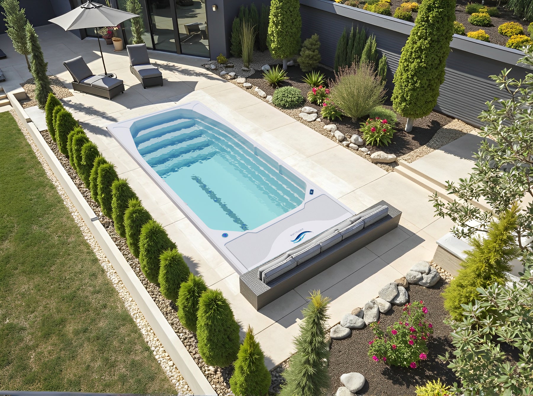 Dieser SwimSpa hält, was der Name verspricht. Ein absolut stylischer Pool, der in jeden Garten passt. Konzentriert auf das Wesentliche, das Schwimmen, verfügt er über eine wunderschöne Treppe über die ganze Poolbreite, die auch zum "chillen" einlädt. Der Spa ist so konzipiert, dass die komplette Technik in einem Schacht untergebracht ist mit Serviceluke von oben. Somit können Sie den Spa im Garten versenken ohne Servicezugänglichkeit. Dadurch können Sie über CHF 15'000.-- einsparen.